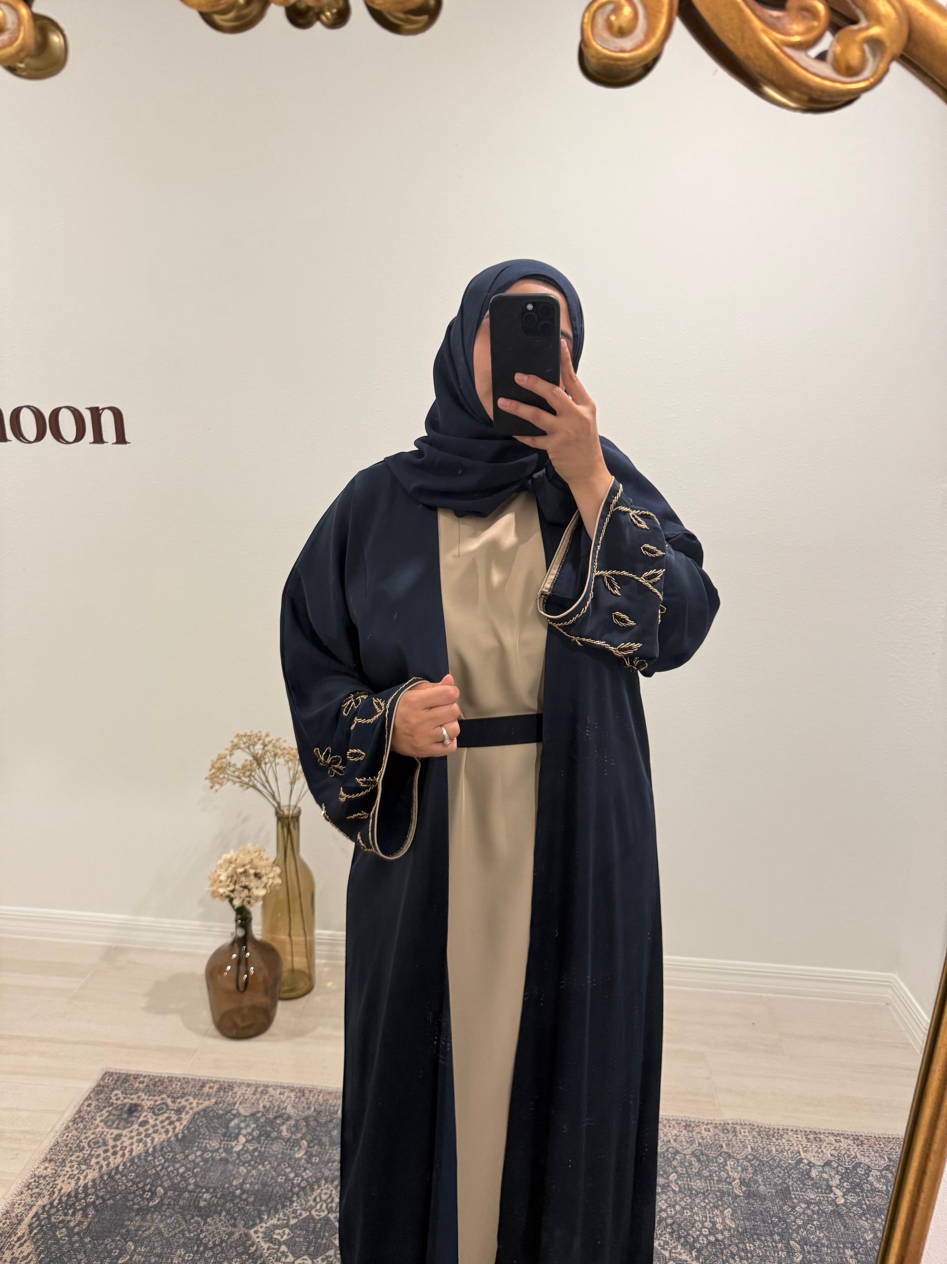 Satin Navy 2 Piece Abaya with Flowers on Sleeves.